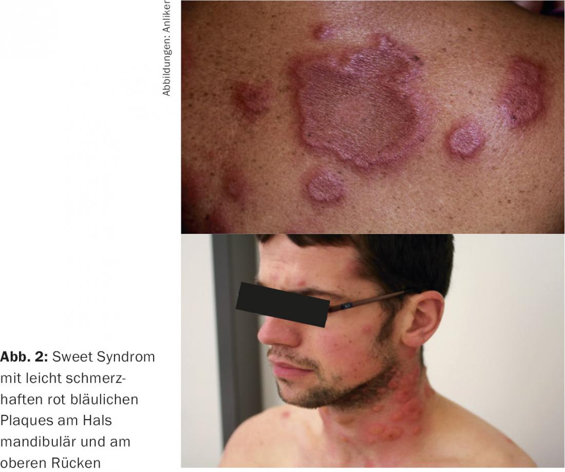 Since RA is strongly driven by the activity of the innate immune system, thus not only by autoantibodies, we find a frequent association with the so-called neutrophilic dermatoses, which are also readily referred to as autoinflammatory. These have mostly been classified accordingly in the recent past and include inflammatory dermatoses such as pyoderma gangrenosum, erythema nodosum, erythema elevatum et diutinum, and Sweet syndrome. In the latter case, which is not uncommon in RA patients, the affected person suffers from general symptoms such as fever, fatigue, swelling of the lymph nodes, greatly increased sedimentation and neutrophilia in the blood count, which is why an infectious process is often thought of. However, the appearance of strongly succulent, highly erythematous bluish plaques on the face, neck, and upper trunk are indicative (Fig. 2) . The diagnosis is made by histopathology, the combination of the various symptoms and the absence of infection. Sweet syndrome is very steroid sensitive.