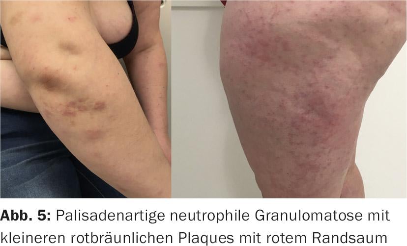 Another typically RA-associated skin disorder is palisade neutrophilic granulomatosis, which manifests with rather dusky maculopapules and plaques over the elbow hand edge or back; this dermatosis is not always easily distinguishable from the previously described disease. Again, as in interstitial granulomatous dermatitis, the overactivity of the innate immune system is triggering and the response to internal steroids is striking [5].