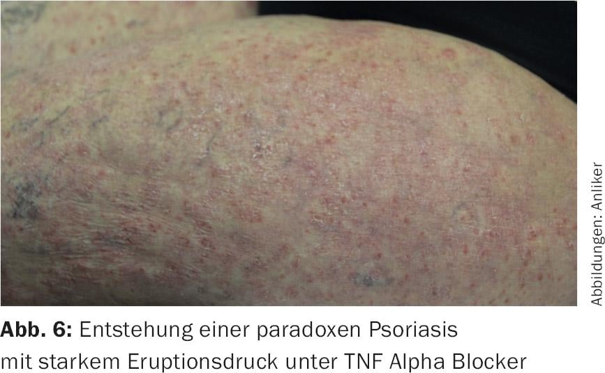 With the so-called biologics, the risks of infection are lower, although a particular weakness against the defenses of tuberculosis and lymphoma should be noted, and this is especially true for the TNFα-blockers. These can also induce a whole range of other side effects. The first to be mentioned is certainly paradoxical psoriasis under TNFα-blockade (Fig. 6) [6], which is due to the sudden overweighting of the innate immune system and may also have a strong neutrophilic even pustular touch. In addition, the triggering of dermatomyositis has also been described. In addition, veritable allergic reactions of the immediate type up to anaphylaxis occur repeatedly. Ultimately, the triggering of lupus erythematosus by these substances is not uncommon. This applies in particular to infliximab and adalumimab. From the last preparation, I examined eight affected individuals, all of whom had very atypical and sparse lupus symptoms; photosensitivity and vasculitis were predominant, but the development of lupus panniculitis was also observed. Frequent detection of anti-histone antibodies has been successful [7].