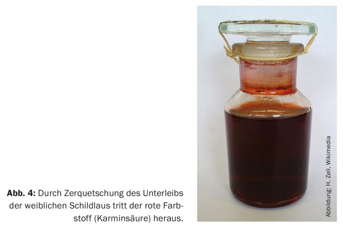 The recipe of Campari bitters is said to contain over 80 ingredients and is kept secret. However, some ingredients are known. According to the Campari Group, only Luca Garavoglia, the company’s president, produces the base concentrate with the help of the technical director and eight employees. Luca Garavoglia is also said to be the only person who knows the complete original recipe. This includes quinine and bitter herbs, rhubarb, pomegranate, spices, ginseng, citrus oil and orange peel. One of the main ingredients is the bark of the Cascarilla tree. The food colorant carmine (E120) is used for the intense red color. True carmine (cochineal, E120) is mainly used as a natural colorant for alcoholic and non-alcoholic beverages (San Pellegrino Sanbitter, Aperol, etc.), food products, and medical and cosmetic products (lipstick, eye shadow). Carmine is extracted from dried powdered females of the tropical scale insect Dactylopius coccus. The cochineal scale insect (cochineal aphid or cochineal) is a species of insect originally found in Central and South America as a pathogen on opuntias (cacti). From the female animals carminic acid is obtained, which is the basis for the production of the dye carmine. The females of the cochineal scale insect are wingless, broad-ovate to round, and about 6-7 mm long (Fig. 3) .