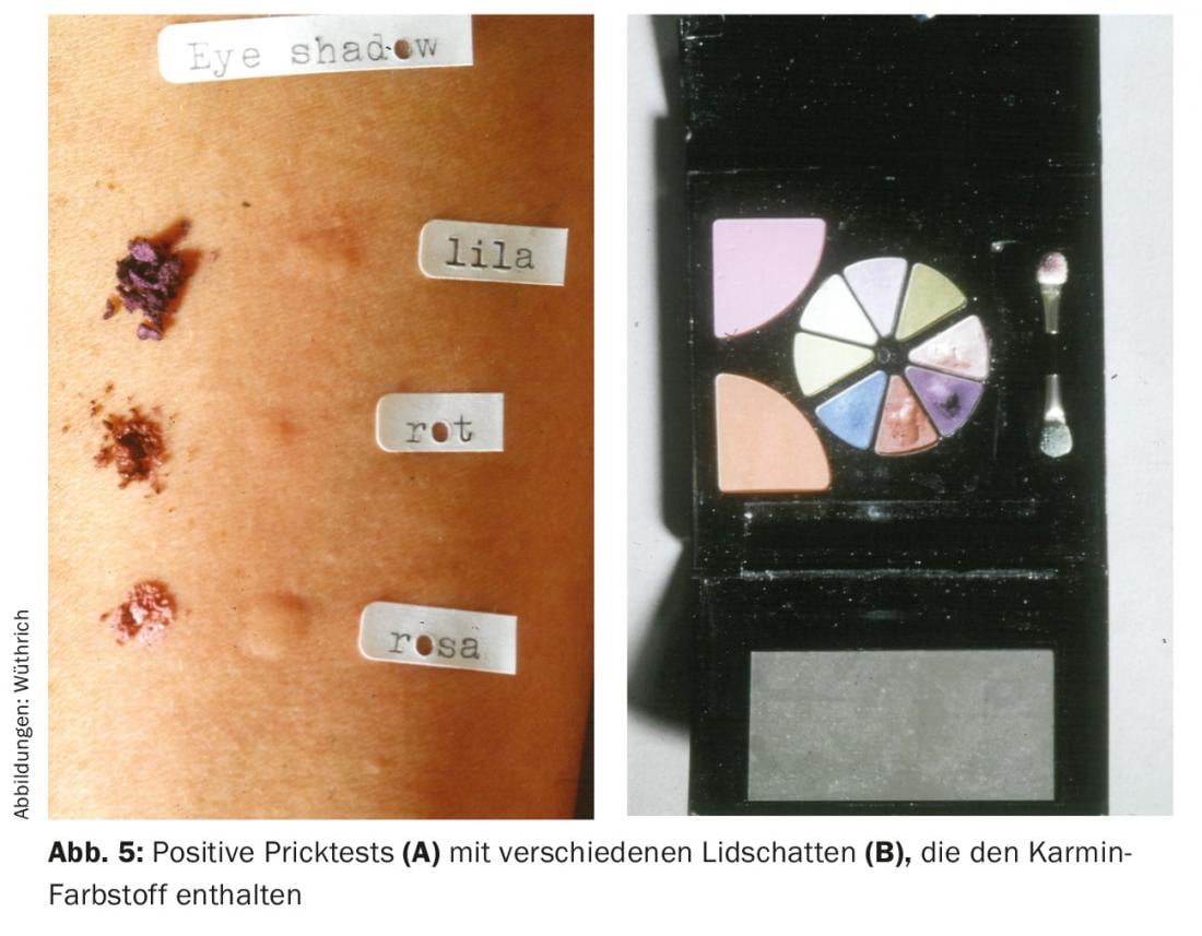 As early as 1961, three cases of contact allergy (late type reaction) to the carmine red contained in lipstick were described [1]. However, the observation made in Zurich is the first description of an immediate-type allergy to carmine with detection of specific IgE antibodies [2]. Subsequently, we described another three cases (box) [3,4] and after our publication, the publication of another case appeared in France [5]. A later report involved severe asthma after occupational exposure to the food dye cochineal/carmine [6]. Additional cases were published along with reviews in 1999 and 2009 [7,8]. The last case report in 2015 involved a 52-year-old woman with repeated anaphylactic reactions associated with colored analcoholic beverages and fruit juices [9].