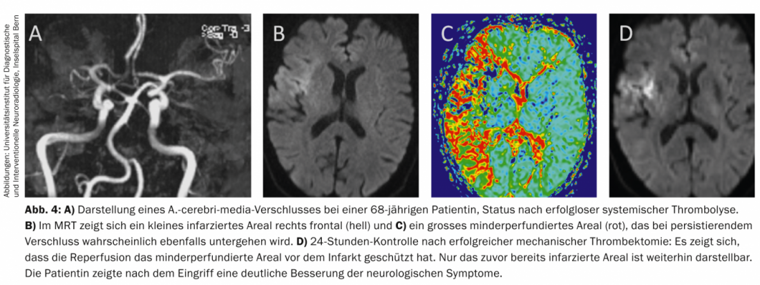 The largest study of second-generation thrombectomy, the STAR trial, was initiated in Switzerland and conducted in Europe, North America, and Australia [6]. This prospective thrombectomy study for the treatment of acute stroke examined 202 patients with vascular occlusions of the anterior circulation (internal carotid artery, cerebri medial artery) in a single-arm design. The mean age was 72 years, and the NIHSS score was 17, equivalent to severe stroke. All patients were treated in the eight-hour time window, some after intravenous thrombolysis had been performed but was unsuccessful. Relevant recanalization (≥TICI2b, “thrombolysis in cerebral infarction” grading) was achieved in 79.2% of cases, and favorable clinical recovery of patients was found in 57.9% (modified rankin scale ≤2). The recanalization time was 29 minutes on average. The study had a patient mortality rate of only 6.9%, and the rate of symptomatic intracranial hemorrhage was low at 1.5% (Figs. 3 and 4).