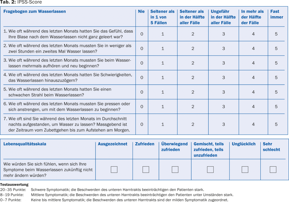 A thorough medical history is essential. International questionnaires such as the IPSS (International Prostate Symptoms Score) may be useful. It contains eight questions, seven on symptoms and one on quality of life (Table 2). The history should also include questions about hematuria, previous surgery, accidents, neurogenic diseases (e.g., Parkinson’s disease, multiple sclerosis), previous drug therapies, infections, and diabetes mellitus.