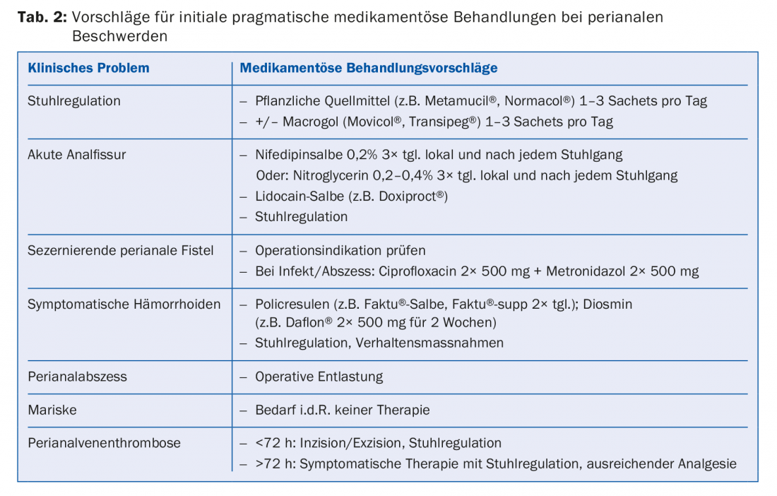 Perianal vein thrombosis is a visual diagnosis and is associated with anal pain and a pressure-dolent, bluish-livid lump on the anus [1]. It is provoked in particular by heavy pressing or prolonged sitting and may also occur in women peripartum or in the context of hormonal changes. Perianal vein thrombosis that persists for less than 72 h can be incised or excised under local anesthesia. However, if the thrombosis persists >72 h, treatment is conservative with stool regulation, analgesia, and flavinoids (e.g., Daflon®). They often leave a mariske, which can be surgically removed if it is bothersome.