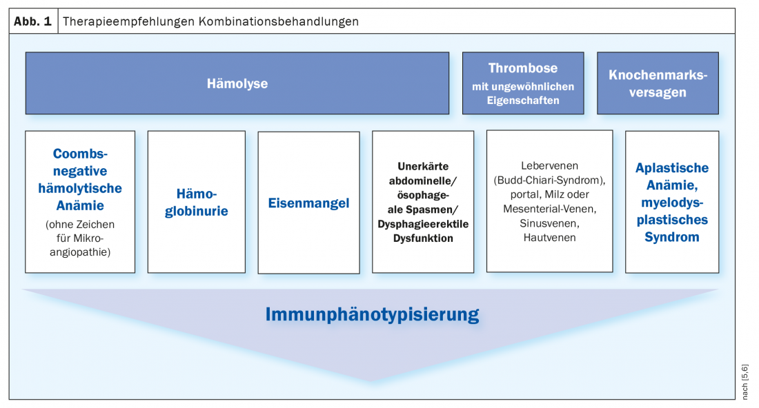 In asymptomatic patients with unremarkable laboratory values, no treatment is usually required. However, these patients should be followed up regularly with blood counts, hemolysis parameters, and flow cytometry. In patients requiring treatment, the focus is on symptomatic therapy. A folic acid substitution is mandatory, as well as the administration of vitamin B12 and iron, depending on the laboratory values. Depending on the clone size and as needed, further supportive measures may be taken. In addition, inhibition of the terminal complement pathway is achieved by a monoclonal antibody such as eculizumab or ravalizumab. Infusion with these compliment inhibitors should occur every two or eight weeks. This can inhibit complement-mediated intravascular hemolysis, reduce transfusion requirements, improve patient quality of life, and also reduce the risk of thromboembolic events, which are the leading cause of death in PNH.