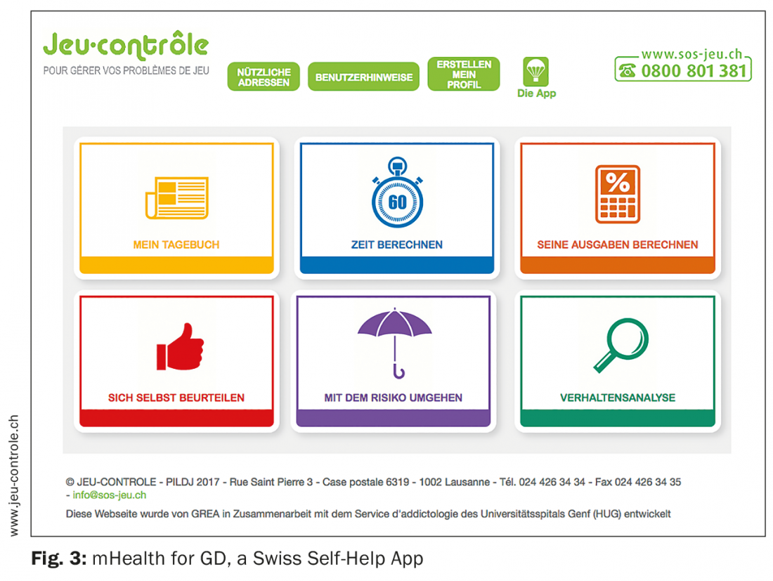 In spite of available treatments, only a very small part of people with GD asks for help. Internet delivered treatments for GD has been shown to be promising [11]. A Swiss mobile App (www.jeu-controle.ch) has recently been launched (Fig. 3). It was developed to help subjects to increase their control over gambling behavior (e.g. time and money spent) and to sustain their motivation to achieve their own goals. They are given a specific personalized feedback reinforcing goal achievements and a visualization of their gambling behavior and mood evolution [11]. The app and the related website could also be used as a complementary resource to face-to-face psychotherapy.