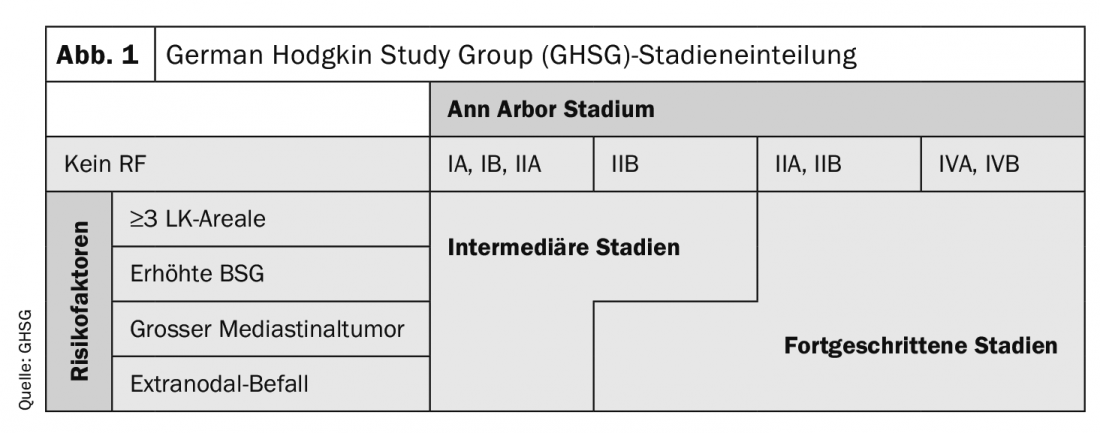 Patients with Hodgkin’s lymphoma (HL) are additionally classified into early, intermediate, and advanced stages according to their risk factors, in addition to the Ann Arbor stages (Fig. 1). The type and intensity of therapy are based accordingly on the stage present . PET can now also be used for initial staging, which has a very clear advantage over contrast-enhanced computed tomography in terms of sensitivity of detection of bone marrow involvement.