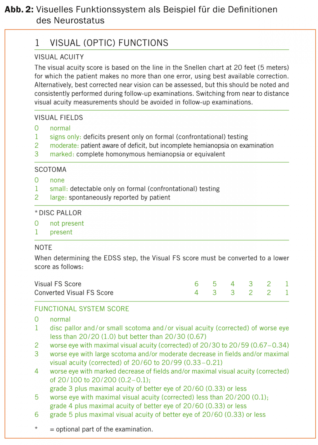 - Visual symptoms (Visual FS), including by means of a high-contrast vision chart and finger perimetry