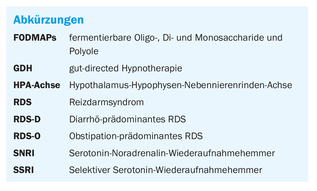 Prognostically, IBS symptoms spontaneously regress in a proportion of patients, but are often chronic, and IBS does not appear to be associated with the development of other gastrointestinal or other serious diseases and does not have increased mortality [8]. However, a high comorbidity with mental disorders has been shown [9]. Due to the lack of curative options, the treatment of IBS is mainly aimed at alleviating the symptoms [10]. Therapeutic measures in this regard against the background of the biopsychosocial model are the subject of this article.