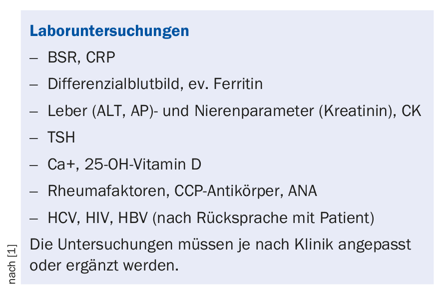 The diagnosis of FM can thus be made solely on the basis of a detailed record of the complaints by interviewing the patient. However, because the impairments for the patients in everyday life are sometimes considerable, the anamnesis must be supplemented by a precise social anamnesis and search for corresponding stress factors (work: dissatisfaction at work, emotional stress; household; leisure; partner relationship). In addition, a careful body status is indispensable in the clarification. However, the clinical examination is no longer intended to search for and diagnose “pain disease” by means of positive tender points. A thorough clinical examination as well as a complementary laboratory workup should identify other diseases and disorders that rule out FM and may be amenable to specific therapy. Possible differential diagnoses are summarized in table 1, and the recommended laboratory investigations are listed in the box.