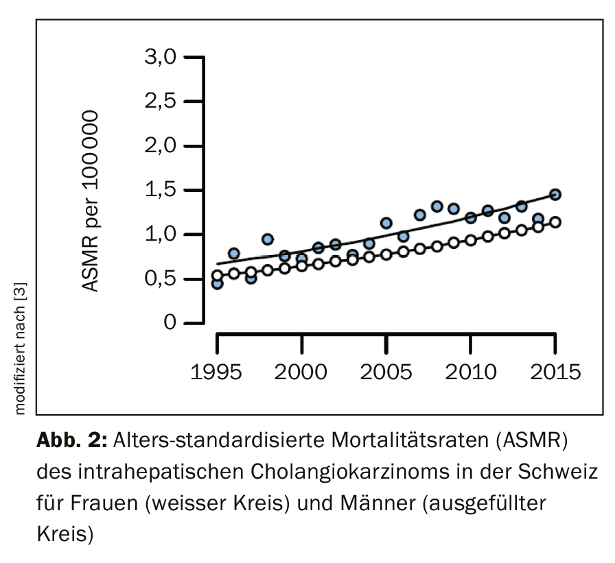 For reasons that remain unclear, the incidence of intrahepatic cholangiocarcinoma has increased over the past two decades in Switzerland and worldwide (Fig. 2), whereas rates of extrahepatic cholangiocarcinoma have declined [3]. In general, the incidence of biliary tract cancer increases with age, reaching its peak between the ages of 50 and 70 [4,5]. Patients diagnosed with primary sclerosing cholangitis (PSC) or known choledochal cysts develop carcinoma nearly two decades earlier on average. In contrast to gallbladder cancer, which affects women at a significantly higher rate, the incidence of cholangiocarcinoma is slightly higher in men [4]. This likely reflects the higher incidence of PSC in men.
