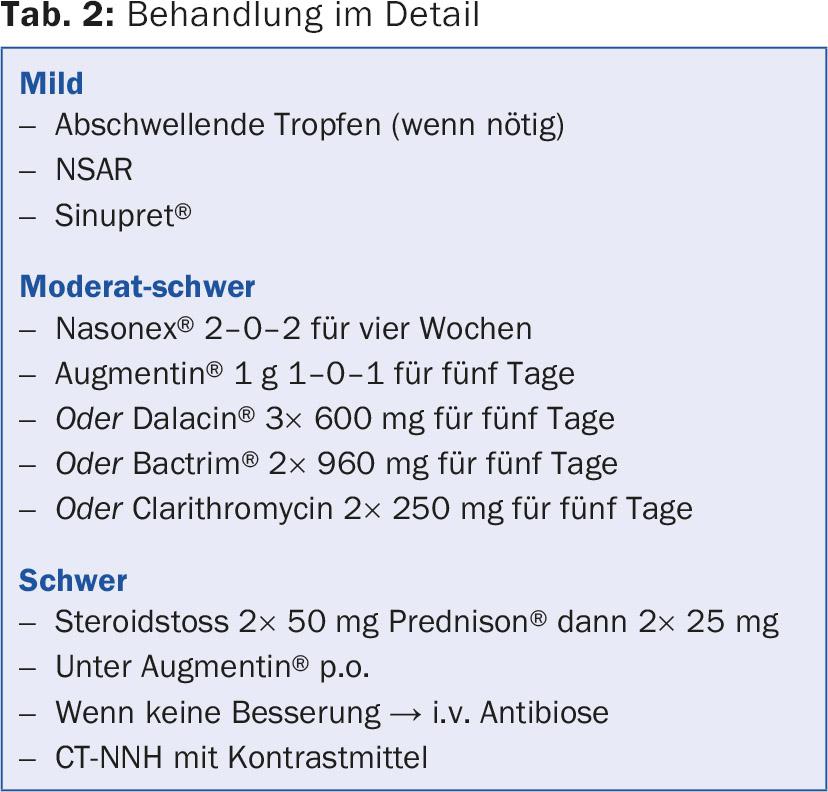 Routine work-up in the practice includes external inspection (tapping dolence, sensory loss, orbita/ocular motility) and rhinoscopy (otoscope with large funnel, possibly swab middle nasal passage). A pus route posteriorly and dental problems can be clarified orally. Conventional X-ray is diagnostically unhelpful and therefore not indicated. If the clinic is severe, if complications are suspected, or if immunosuppression is present, a high-resolution CT (HR-CT) of the paranasal sinuses may be performed.