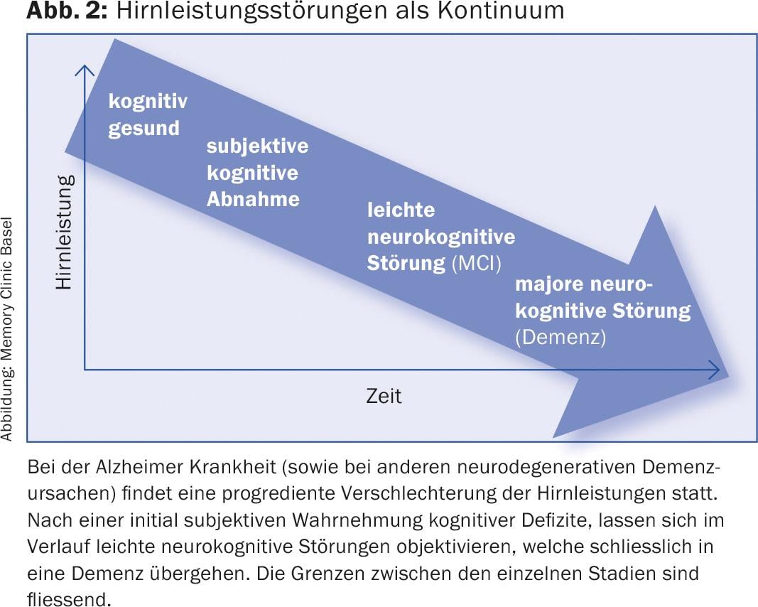 Además de la detección precoz de los trastornos cerebrales, otro foco de atención de la investigación actual es la prevención del deterioro cognitivo. sobre el retraso del deterioro en el caso de que ya sólo existan trastornos cognitivos subjetivos u objetivables muy leves. La enfermedad de Alzheimer, la causa más común y por tanto más importante de demencia, se utiliza como modelo en estas consideraciones. En la enfermedad de Alzheimer se produce un deterioro continuo, desde un rendimiento inicialmente normal a sólo subjetivo, pasando por trastornos cognitivos leves hasta la demencia (Fig. 2) . En los últimos años, además de los factores de riesgo no modificables, como la edad o la predisposición genética, también se ha hablado de los factores de riesgo sobre los que se puede influir potencialmente [5].
