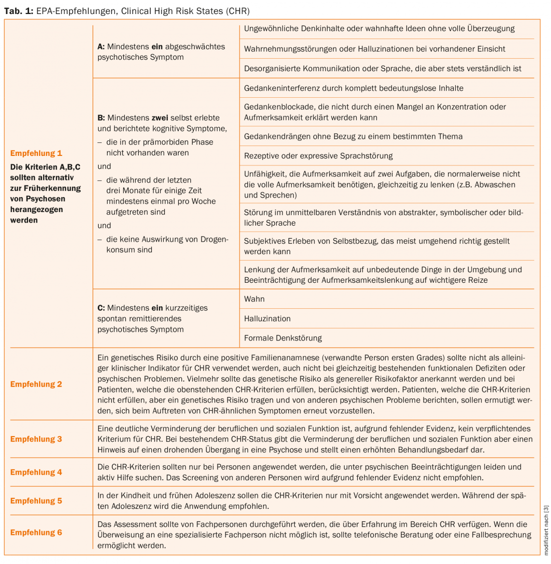 Existen diferentes enfoques para evaluar el riesgo de psicosis, el llamado Estado Clínico de Alto Riesgo (CHR, por sus siglas en inglés). Un metaanálisis reciente [3] ofrece una visión general de las herramientas de evaluación existentes. Los autores han elaborado seis recomendaciones en nombre de la Asociación Europea de Psiquiatría (EPA) (Tab. 1).