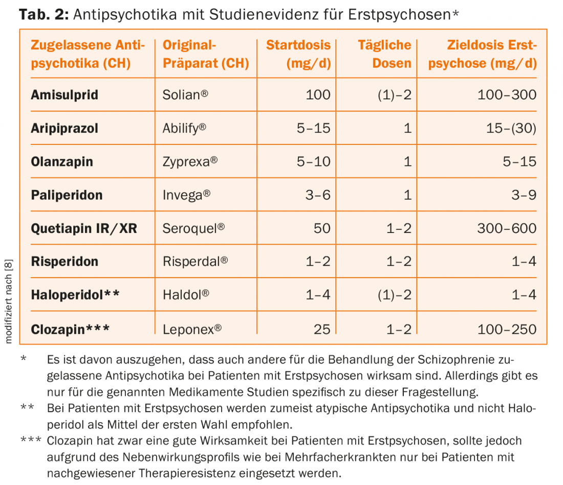 Con respecto a la farmacoterapia, existe consenso en que la terapia antipsicótica debe iniciarse lo antes posible en la psicosis manifiesta. Las características especiales en los enfermos primerizos son unas tasas de respuesta más elevadas incluso a dosis bajas, pero también una mayor sensibilidad a los efectos secundarios. Las distintas directrices internacionales no adoptan una postura uniforme respecto a la preferencia de los antipsicóticos atípicos sobre los típicos, siendo los atípicos los preferidos en Suiza. Las diferencias de eficacia parecen ser menos pronunciadas de lo que se suponía en un principio [6]. Los antipsicóticos típicos provocan más a menudo efectos secundarios motores extrapiramidales, mientras que los atípicos provocan más a menudo un aumento de peso. Al mismo tiempo, hay que señalar que los antipsicóticos atípicos representan un grupo heterogéneo de fármacos. Si es posible, deben tenerse en cuenta los estudios realizados específicamente en pacientes con la primera enfermedad (Tab. 2) [8].