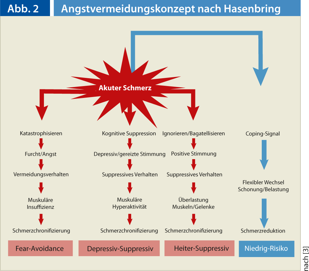 Una ampliación del concepto de miedo-evitación para explicar el dolor crónico es la que muestra Hasenbring (Fig. 2 ) [3]. Distingue distintos tipos de carácter a la hora de enfrentarse al dolor crónico: