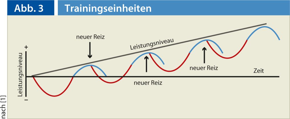 Una adaptación óptima del entrenamiento debe ir siempre acompañada de una estimulación eficaz de la carga, que a su vez depende del rendimiento físico actual del deportista (fig. 3) [1]. Con una relación coordinada entre la estimulación y el descanso adecuado, se puede mejorar el rendimiento físico. En el transcurso del proceso de entrenamiento, es importante aumentar la carga lenta y cuidadosamente. La ampliación del alcance temporal de los requisitos debe tener lugar antes del aumento de la intensidad. Para alcanzar y mantener el rendimiento físico deseado, es necesario repetir cargas significativas con regularidad y durante mucho tiempo. Los cambios morfológicos y fisiológicos en el músculo y el metabolismo sólo son detectables tras cuatro o cinco meses de entrenamiento [7]. El entrenamiento orientado a la salud debe ser lo más permanente posible y diversificarse variando los tipos de ejercicio. En la aplicación práctica del entrenamiento, hay que tener en cuenta el rendimiento dependiente de la edad, biológico y psicológico.