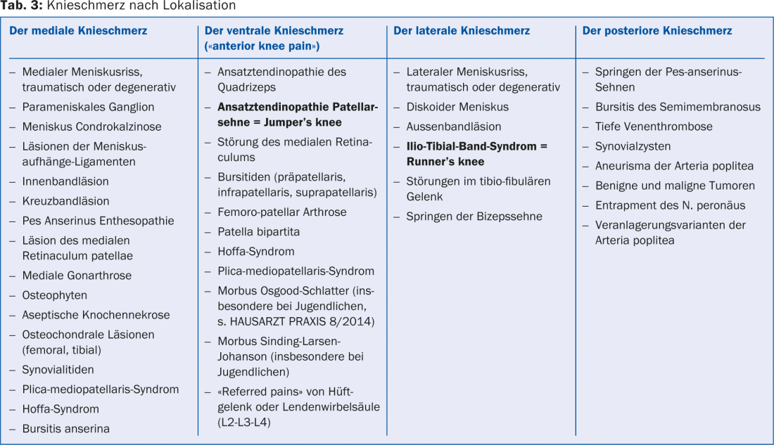 Hace unos años, en unas estadísticas que nunca se han publicado, pudimos demostrar la frecuencia con la que aparecen dolores y problemas de rodilla en las consultas de los médicos de cabecera (tabla 1). En consonancia con muchas otras encuestas, la frecuencia relevante de las dolencias de rodilla, agudas y relacionadas con el uso excesivo, también se confirmó en medicina deportiva, así como en medicina general. Este artículo ofrece una visión general por lugares y profundiza en dos diagnósticos específicos.