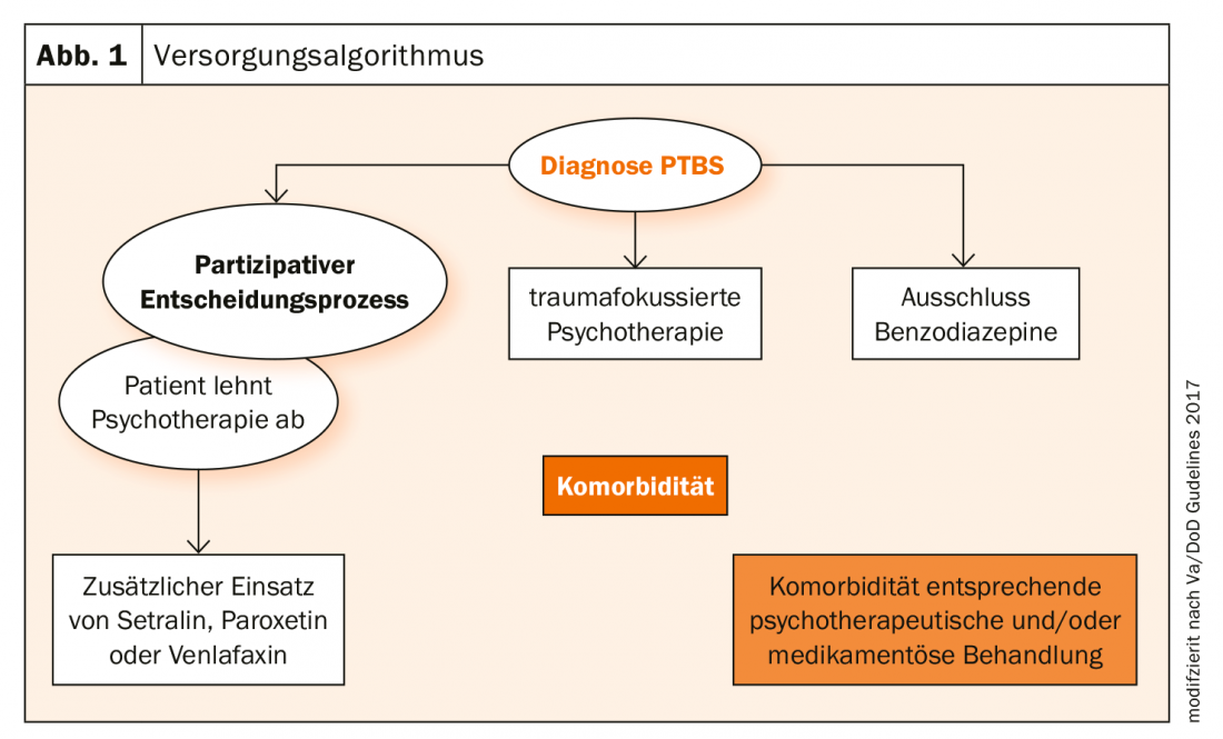 El objetivo es mejorar los síntomas y restablecer la funcionalidad. La directriz actual indica que la psicofarmacoterapia no debe utilizarse como terapia única o primaria para el TEPT. Si, tras un proceso de toma de decisiones informado y participativo, se prefiere un medicamento a pesar de sus escasos efectos, sólo debe ofrecerse setralina, paroxetina o venlafaxina. Las benzodiacepinas, por el contrario, no deben utilizarse (Fig. 1).