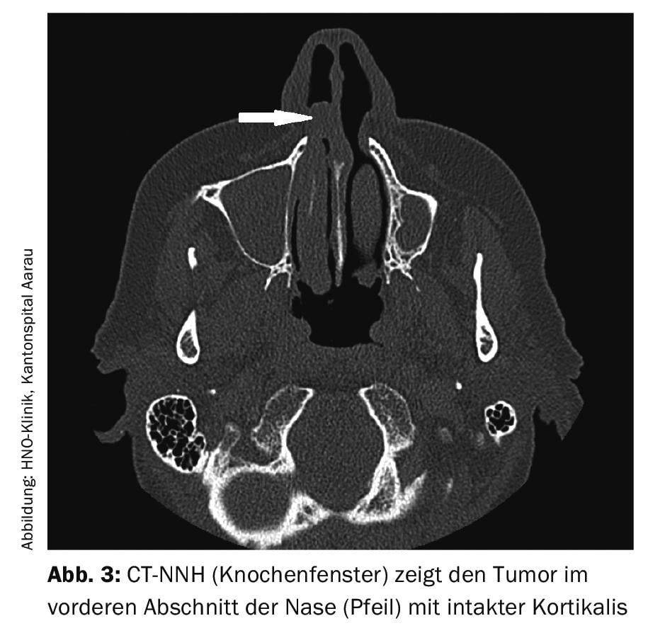 La resonancia magnética es significativamente más específica que la tomografía computerizada para el diagnóstico del melanoma maligno. Esto se debe a las propiedades paramagnéticas de la melanina. A menudo, el diagnóstico debe complementarse con una tomografía computarizada para evaluar la posible invasión de estructuras óseas (Fig. 3).