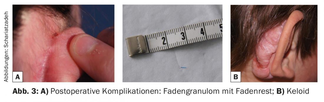 Las primeras complicaciones incluyen dolor postoperatorio e hipersensibilidad en la zona del pabellón auricular, hemorragias, en particular también hematoma subpericondral con amenaza de necrosis del cartílago, infecciones, así como úlceras por presión, por ejemplo causadas por el vendaje de la oreja. La rotación de la concha puede provocar el estrechamiento del conducto auditivo. Por lo general, esto puede evitarse tirando del pabellón auricular en sentido craneodorsal; de lo contrario, puede ser necesaria una escisión de cartílago en la zona del conducto auditivo. Las complicaciones tardías incluyen la formación de queloides o fístulas de sutura (Fig. 3), que se manifiestan como granulaciones punteadas que no cicatrizan, a menudo con un extremo de sutura visible. En estos casos, debe retirarse el hilo. Si la otoplastia se realizó hace más de seis semanas, la retirada de las suturas no provoca una reaparición de la deformidad [5]. También pueden producirse deformidades residuales, asimetrías y trastornos de la forma, como que el pabellón auricular esté demasiado apretado, que sobresalgan las partes superior e inferior del pabellón auricular (“oreja de teléfono”) o la parte media del pabellón auricular (“oreja de teléfono invertida”) [1].