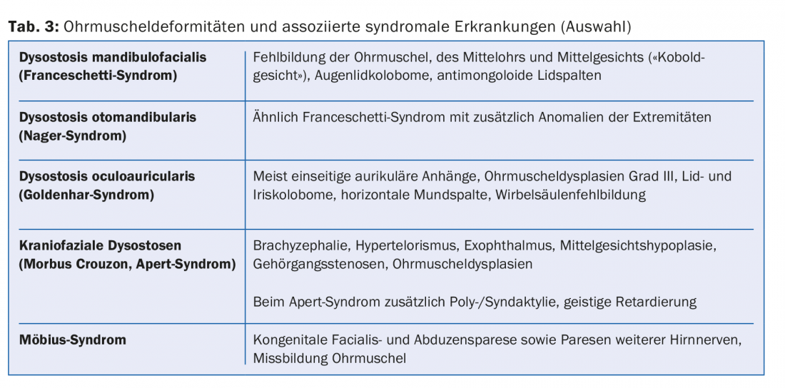 No es infrecuente que también se produzcan malformaciones moderadas y graves del pabellón auricular con displasia del oído medio y/o interno; en algunos casos, también se producen en el contexto de enfermedades sindrómicas (Tab. 3) [4]. Además de los factores genéticos, también influyen factores exógenos (talidomida, embriopatía por rubéola, otras infecciones víricas, alcoholismo, etc.) [1] y factores desconocidos. La complejidad de las malformaciones auriculares se explica por la formación o fusión incompleta de las seis cúspides auriculares mesenquimales alrededor de la sexta semana embrionaria [3,5].