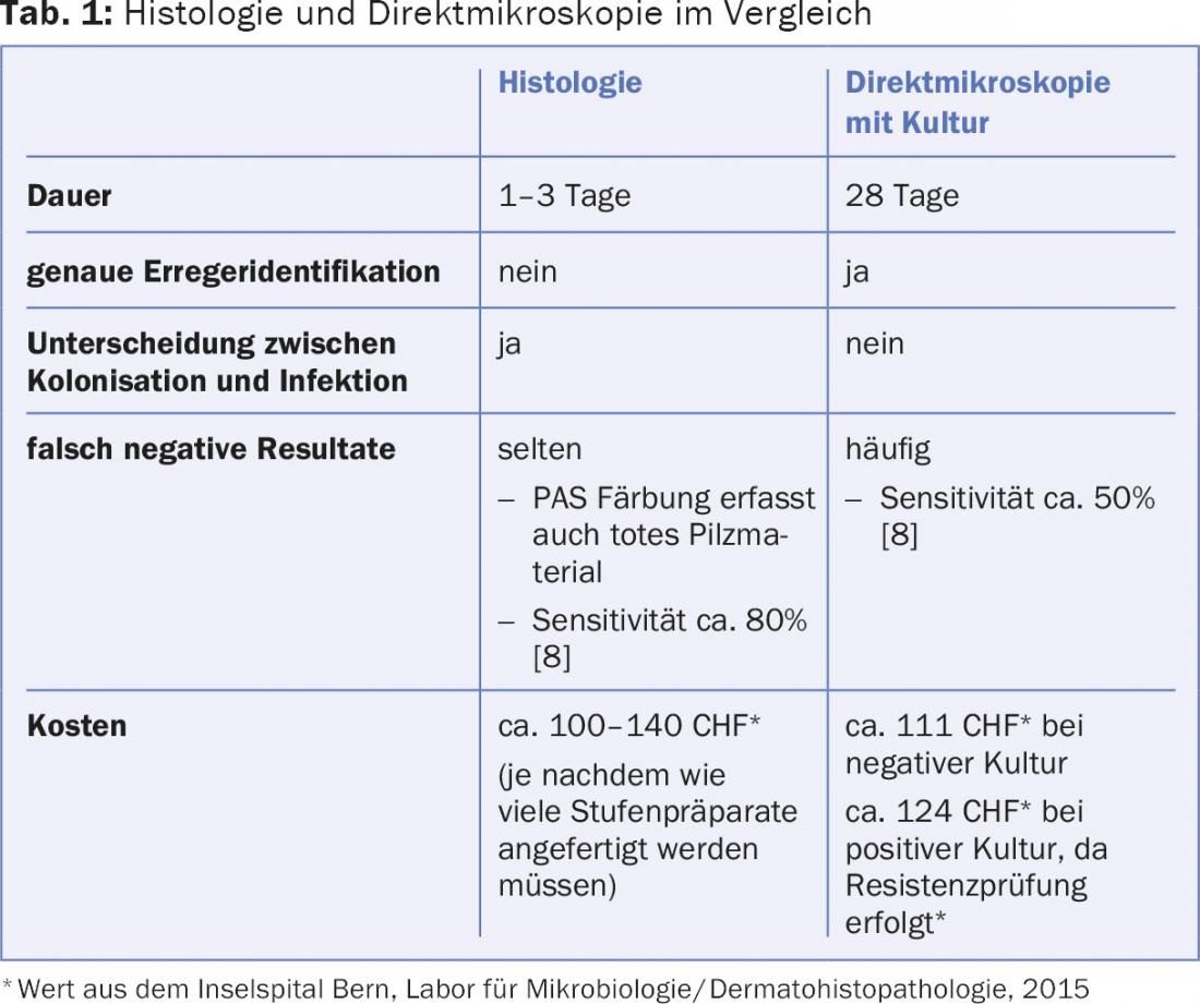 Los diagnósticos de laboratorio son opcionales antes de la terapia tópica, pero obligatorios antes de cualquier terapia sistémica. Entretanto se han establecido dos procedimientos de examen. Una es la histología y la otra es la microscopía directa con cultivo. La histología permite diferenciar entre colonización e infección (Fig. 4) . El cultivo permite determinar con exactitud el agente patógeno. Las principales ventajas e inconvenientes de ambos métodos se enumeran en la tabla 1 . Debido a los resultados frecuentemente falsos negativos del cultivo, recomendamos la histología como procedimiento diagnóstico. En casos complejos, pueden realizarse ambas medidas de diagnóstico.