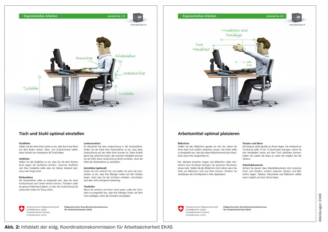 Terapia: La terapia pretende modificar los patrones de postura y movimiento desfavorables para que disminuya la tensión sobre el tejido dañado. En consecuencia, se debe informar al paciente sobre el problema subyacente e instruirle sobre la ergonomía (Fig. 2) . La aplicación en la vida cotidiana necesita mucho compromiso por parte del paciente. Esto sólo es posible si comprende el panorama general.