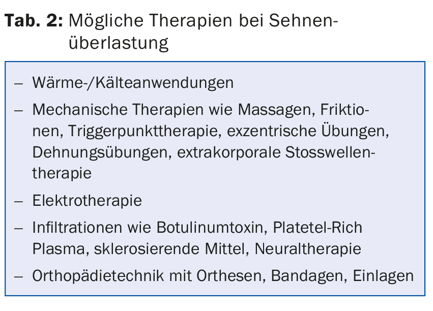 Ejemplos típicos de sobrecarga tendinosa en la práctica son la placa del tendón extensor del antebrazo en el codo de tenista, la placa del tendón del manguito rotador del hombro o el complejo tendón/fascia del tendón de Aquiles y la aponeurosis plantar. En los deportistas, por ejemplo, la rodilla de corredor con tendinopatía del tracto iliotibial (“síndrome de la banda iliotibial”, ITBS) es un motivo frecuente de consulta.