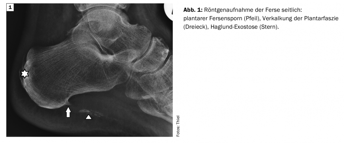 Les patients souffrant d’une épine calcanéenne symptomatique décrivent souvent leurs symptômes en des termes similaires (aperçu 2). La surcharge entraîne une inflammation des tendons, dans ce cas du fascia plantaire, à la base de l’os. Des calcifications minuscules se forment et, si le stress se poursuit, elles deviennent progressives et conduisent à la formation de l’éperon. Outre cette fibrosite productive, on peut également observer la forme rare raréfiante, qui se reconnaît par une perte de substance osseuse circonscrite à l’enthèse. Cette symptomatologie peut conduire à une posture de décharge et à une mauvaise mise en charge [4]. Les personnes concernées posent alors en priorité la partie avant du pied ou appuient davantage sur le bord extérieur du pied, ce qui entraîne une marche boiteuse en position de pied pointu. Des douleurs croissantes dans le talon, sur le côté et dans la partie inférieure de la jambe peuvent survenir de manière consécutive.