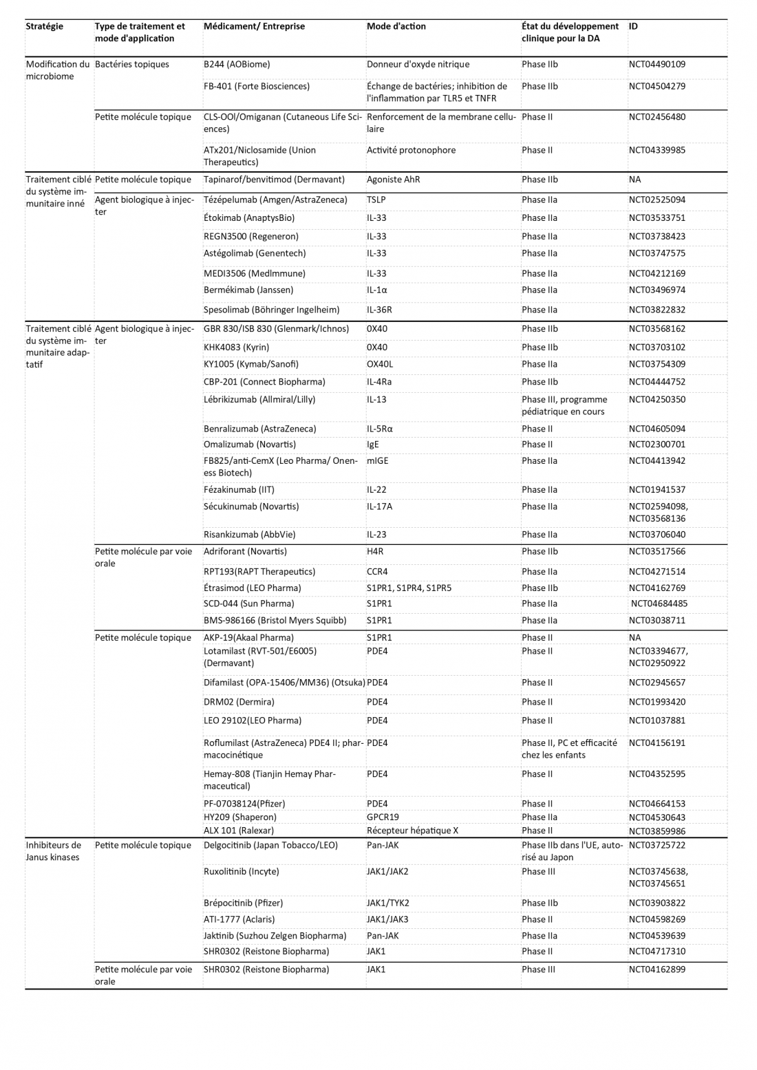 Plus de 80 nouveaux traitements pour la DA sont actuellement dans le pipeline. Les modes d’action de ces traitements en cours d’élaboration vont de la modification du microbiome cutané au traitement ciblé de la réaction immunitaire excessive en passant par le rétablissement de la fonction barrière de la peau. Les traitements en cours de développement à partir de la phase II sont énumérés dans le tableau ci-après [50]: Légende: AhR, récepteur d’aryl hydrocarbone; CCR4, récepteur de chimiokine C- C type 4; GPCR19, récepteur 19 couplé aux protéines G; H4R, récepteur de l’histamine H4; IL-4Rα, chaîne α du récepteur de l’IL-4; IL-5Rα, chaîne α du récepteur de de l’IL-5; IL-13Rα1, chaîne α du récepteur de l’IL-13; IL-22R1, récepteur 1 de l’IL-22; JAK, Janus Kinase; NA, non applicable; OX40L, ligand OX40; PDE4, phosphodiestérase-4; S1PR1, récepteur 1 de la sphingosine 1- phosphate; TSLP, lymphopoïétine stromale thymique. |