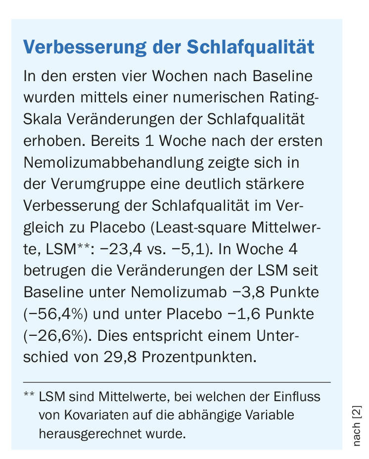 Dans une étude de phase II randomisée en double aveugle et contrôlée par placebo d’une durée de 12 semaines, 70 participants à l’étude présentant un prurigo nodulaire modéré à sévère avec au moins 20 nodules ou un prurigo nodulaire sévère, défini par un score de prurit quotidien moyen de 7/10 (10 = intensité maximale imaginable du prurit), ont été randomisés entre les deux bras de l’étude, némolizumab vs placebo. Les sujets de la condition “verum” ont reçu trois injections sous-cutanées de némolizumab 0,5 mg/kg de poids corporel à la ligne de base, à la semaine 4 et à la semaine 8.