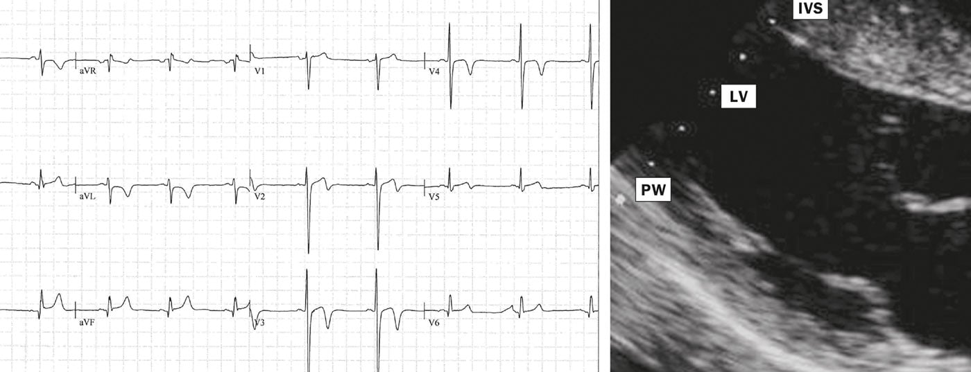 Dans la population générale, la cardiomyopathie hypertrophique (CMH) est la cardiomyopathie la plus fréquente, avec une prévalence de 0,2%. Elle est nettement plus faible chez les athlètes (0,07-0,08%), peut-être en raison de la performance généralement un peu réduite des patients atteints de CMH. Dans plus de 90% des cas, la CMH se traduit par un ECG de repos anormal, les négativations T dans les dérivations thoraciques et/ou des extrémités étant déterminantes pour le diagnostic (Fig. 2).