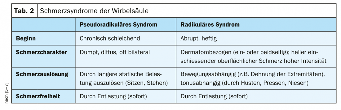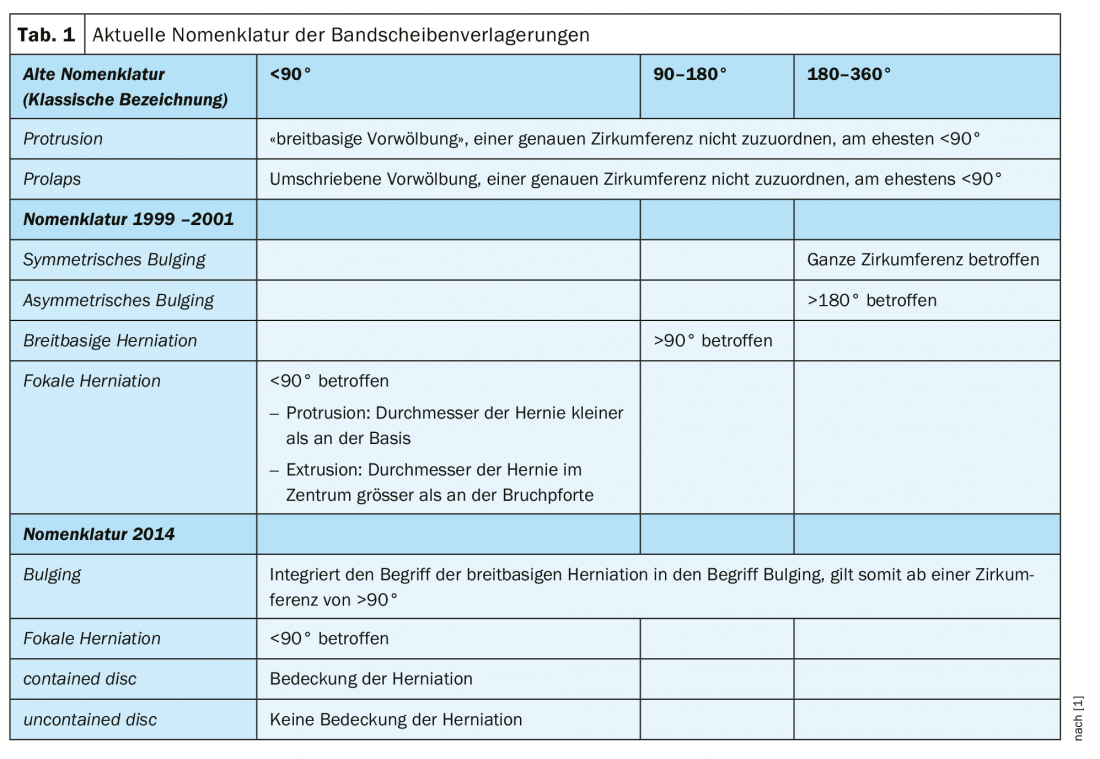 Nella pratica quotidiana, la descrizione dello spostamento del disco come protrusione discale o rigonfiamento del disco e prolasso discale o estrusione è comune e, soprattutto per molti referenti, la nomenclatura comprensibile e alla fine anche comune per molti anni. La differenziazione dei sintomi del dolore vertebrale è elencata nella tabella 2 [6,7,9].