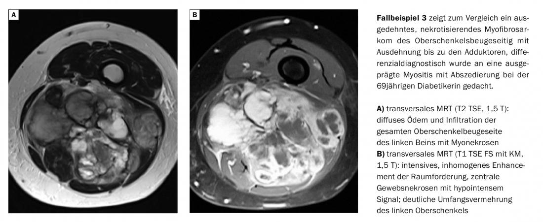 La miosite focale si differenzia per il modello di coinvolgimento (singolo muscolo o compartimento muscolare interessato) e mostra un chiaro aumento del contrasto senza ascesso o necrosi del tessuto. Sono colpiti soprattutto i singoli muscoli della parte inferiore della gamba. Le calcificazioni sono comuni nella miosite parassitaria e le intense reazioni di contrasto accompagnate da necrosi tissutale e ascessi sono quasi regolari nella miosite indotta da agenti patogeni. Le reazioni del tessuto edematoso richiedono l’uso di sequenze a soppressione di grasso per una rilevazione affidabile [9]. Tuttavia, l’evidenza di edema non è solo un’espressione di infiammazione, come mostra la Tabella 1 in termini di diagnosi differenziale.