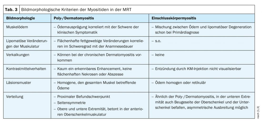 La risonanza magnetica consente una diagnosi tempestiva e un trattamento adeguato ai sintomi. Questo può ridurre i rischi di diagnosi errata e di ritardo nella terapia [4]. La risonanza magnetica è anche uno strumento importante nella pianificazione della biopsia; può fornire informazioni concrete sulla localizzazione e sull’estensione dell’infiammazione muscolare. Un criterio importante per l’estensione della biopsia è il riscontro RM-tomografico dell’estensione dell’infiammazione alla fascia muscolare, che deve essere anch’essa sottoposta a biopsia.
