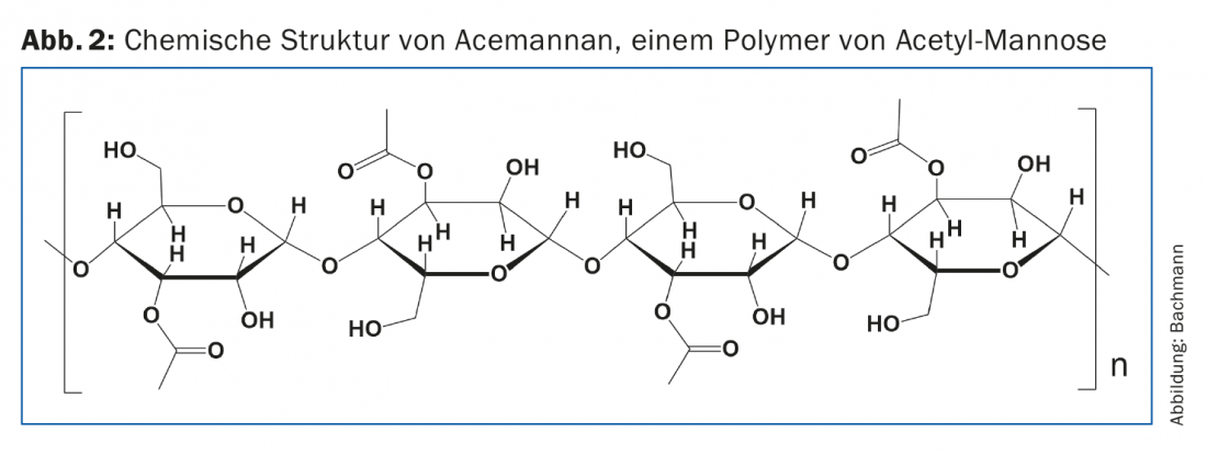 Un recente studio pubblicato da un team di Taiwan riporta l’effetto protettivo dell’aloe sullo stress ossidativo indotto dal calore sui fibroblasti [4]. Lo stesso effetto del gel di aloe vera è riportato da Tanaka et al. che nella loro pubblicazione [5] descrivono una combinazione di uno studio in vitro con uno studio clinico. Nello studio in vitro, hanno analizzato la capacità del succo di aloe vera di stimolare i fibroblasti della pelle umana. Questi aumentano la formazione di collagene e acido ialuronico da una volta e mezza a due volte, grazie all’influenza del succo. L’effetto benefico sulla pelle è attribuito ai seguenti ingredienti nello studio di Tanaka et al: Polisaccaridi, aminoacidi, lipidi, steroli e tannini. Acemannan è (Fig. 2) è il polisaccaride più importante dell’Aloe vera.