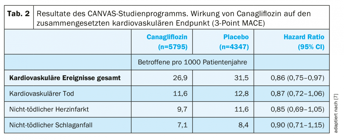 I due studi gemelli del programma CANVAS hanno incluso oltre 10.000 pazienti con T2DM e rischio cardiovascolare da alto a molto alto e li hanno randomizzati al trattamento con canagliflozin o placebo [7]. L’endpoint primario MACE a 3 punti, costituito da morte cardiovascolare, infarto miocardico non fatale e ictus non fatale, è stato osservato significativamente meno frequentemente con canagliflozin rispetto al placebo (superiorità, p=0,02), Scheda. 2) [7]. Inoltre, ad eccezione dei pazienti che assumono diuretici, il beneficio della terapia con canagliflozin è stato raggiunto in tutti i sottogruppi definiti [7]. La maggior parte degli effetti avversi osservati con canagliflozin corrispondeva al profilo di sicurezza già noto [7]. Nel complesso, gli eventi avversi gravi si sono verificati meno frequentemente con canagliflozin rispetto al placebo (104,3 vs. 120,0 eventi avversi per 1000 anni-paziente, HR: 0,93) [7]. Il rischio di amputazione è aumentato con canagliflozin (6,3 vs. 3,4 persone colpite per 1000 anni-paziente; HR, 1,97), ma non è stato possibile stabilire una relazione causale tra la terapia con canagliflozin e l’aumento del rischio di amputazione. La maggior parte delle amputazioni era a livello dell’alluce o del metatarso e i fattori di rischio includevano una storia di amputazione, una malattia arteriosa periferica o una neuropatia [7,8]. In un altro studio, non è stato osservato un aumento del rischio di amputazioni con canagliflozin [9].