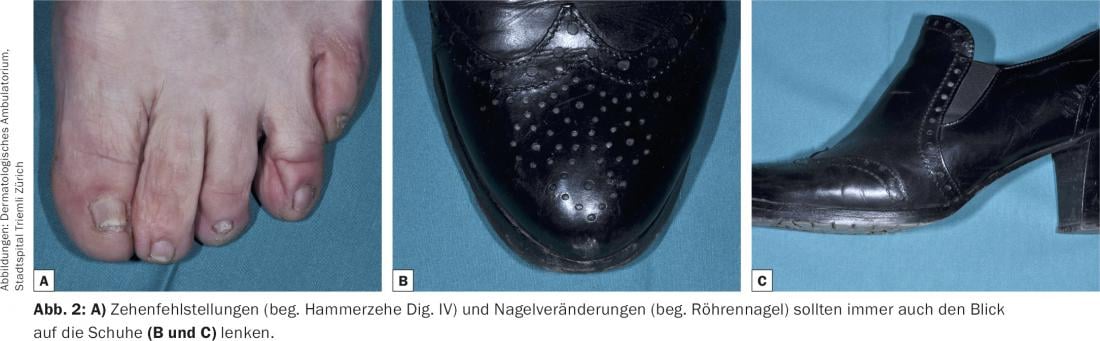 I piedi e quindi anche la loro pelle e le unghie dei piedi sono sollecitati ogni giorno. C’è un’interazione tra il piede e la scarpa. Il solo fatto di indossare scarpe chiuse può contribuire all’insorgere di lesioni e malattie della pelle. Le malposizioni possono accentuare ulteriormente questo aspetto attraverso una distribuzione non uniforme della pressione durante la camminata, carichi di pressione puntuali nella scarpa e spazi particolarmente stretti tra le dita dei piedi. La terapia spesso richiede un pensiero interdisciplinare da parte del medico curante, nel senso di un trattamento diretto dell’alterazione cutanea e di un rimedio alla causa da un punto di vista ortopedico.