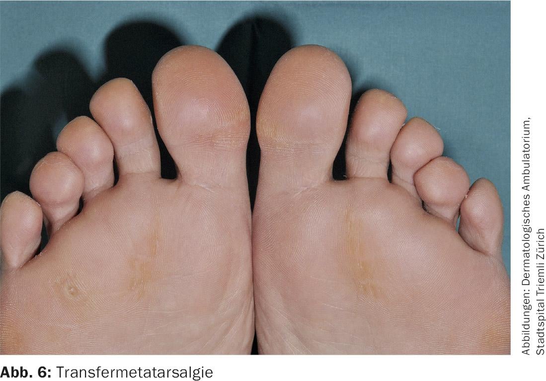 Di conseguenza, si verificano alterazioni cutanee legate alla pressione nell’area della pseudo-esostosi alla base dell’alluce (Fig. 5), nell ‘area delle articolazioni interfalangee dorsalmente a causa della malposizione delle dita a martello e molto spesso nell’area delle teste metatarsali II/III plantari a causa della conseguente distorsione del piede. Quest’ultima, in particolare, è spesso accompagnata dalla formazione di un callo doloroso (noto come ulcera callosa). Metatarsalgia da trasferimento, Fig. 6) e può essere diagnosticata erroneamente come clavus.