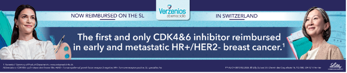 1. Johnston S, et al. Overall Survival with Abemaciclib in Early Breast Cancer, Annals of Oncology (2025), doi: https://doi.org/10.1016/j.annonc.2025.10.005. 2. Verzenios. Summary of Product Characteristics. www.swissmedicinfo.ch 3. Rastogi P et al. J Clin Oncol. 2024;42(9):987-93. 4.  Hortobagyi GN et al. Ann Oncol. 2025;36(2):149-57.