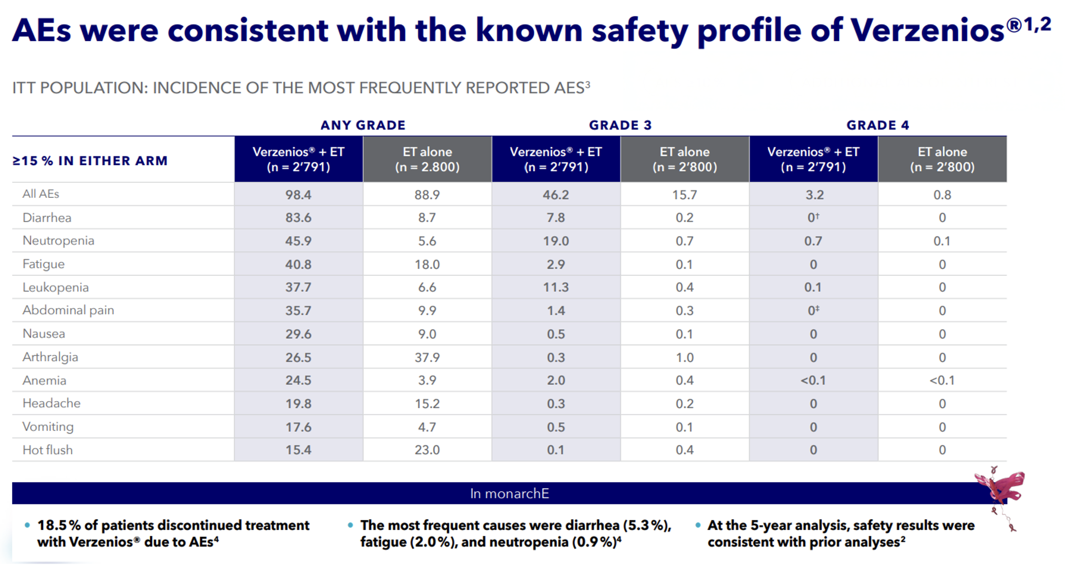 1. Verzenios® Summary of Product Characteristic. www.swissmedicinfo.ch. 2. Rastogi P, et al. Adjuvant Abemaciclib Plus Endocrine Therapy for Hormone Receptor-Positive, Human Epidermal Growth Factor Receptor 2-Negative, High-Risk Early Breast Cancer: Results From a Preplanned monarchE Overall Survival Interim Analysis, Including 5-Year Efficacy Outcomes. J Clin Oncol. 2024 Mar 20;42(9):987-993. 3. Johnston SRD, et al. Abemaciclib plus Endocrine Therapy for Hormone Receptor-Positive, HER2-negative, Node-Positive, High-Risk Early Breast Cancer (monarchE): Results from a Preplanned Interim Analysis of a Randomised, Open-Label, Phase 3 Trial. Lancet Oncol. 2023 Jan;24(1):77-90. 4. Rugo HS, et al. Adjuvant Abemaciclib Combined with Endocrine Therapy for High-Risk Early Breast Cancer: Safety and Patient-Reported Outcomes from the monarchE Study. Ann Oncol. 2022 Jun;33(6):616-627.
