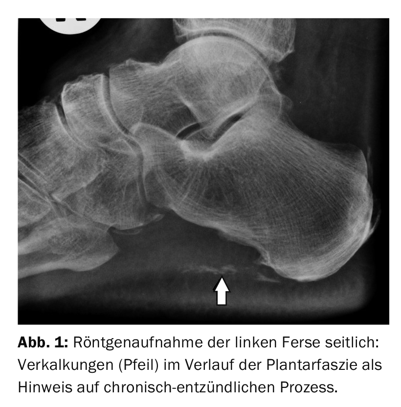 Os raios X em projecção lateral não podem captar a reacção inflamatória da fáscia plantar. Se um esporão de calcanhar plantar for visível, as pessoas tendem a pensar que é a causa dos sintomas. No entanto, é importante lembrar que a fascite e as esporas podem ocorrer simultaneamente. Se nenhum esporão de calcanhar for reconhecível, pode suspeitar-se de fascite plantaris como o gatilho das queixas dependentes da carga, muitas vezes também em combinação com fibroostites calcanei rarefactoras. As calcificações na área da fáscia plantar indicam um curso inflamatório crónico (Fig. 1).