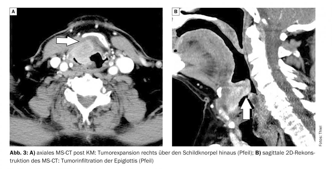 Os artigos anteriores sobre o tema da disfagia já discutiram várias causas, principalmente benignas, de disfagia. Uma causa maligna, o carcinoma hipofaríngeo e laríngeo está agora documentado como uma entidade tumoral, uma vez que no diagnóstico por imagem radiológica a diferenciação do carcinoma laríngeo do carcinoma hipofaríngeo primário não é clara e fielmente possível [5]. Os tumores laríngeos, que muitas vezes têm origem nas cordas vocais , podem crescer para a hipofaringe a partir do ventrículo, de forma deslocada ou infiltrante.