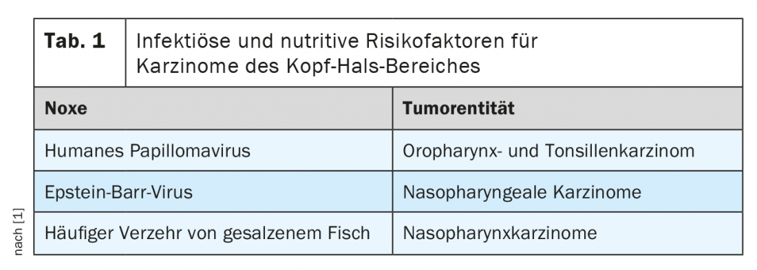 Nos países industrializados, o álcool e o tabagismo estão entre os factores de risco mais importantes para a génese de tumores na cabeça e pescoço. Outros agentes cancerígenos incluem a marijuana e exposições profissionais a determinados gases e fumos (indústria têxtil, transformação de madeira e metais). As infecções virais também podem aumentar o risco de tumores, assim como certos hábitos alimentares, como se pode ver no quadro 1.