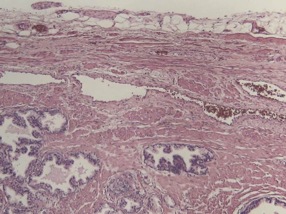 A histopatologia revelou um meningioma de grau I da OMS. Curiosamente, este meningioma continha um carcinoma da tiróide metastásico e pouco diferenciado. Embora a paciente tenha mostrado uma resposta sintomática à metastasectomia e à radioterapia de feixe externo, morreu um ano depois de complicações da síndrome de cauda equina.