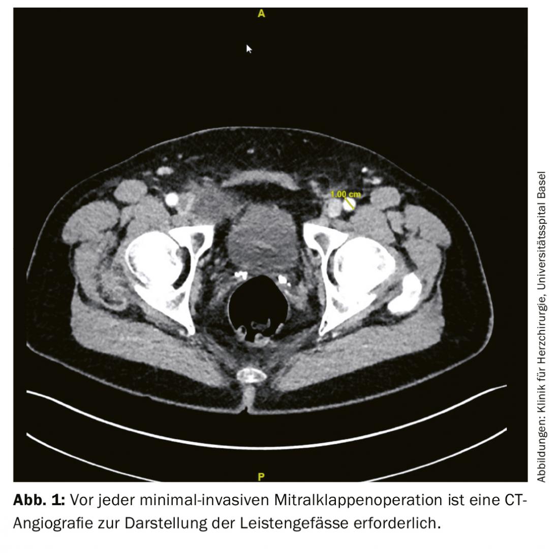 Após o consentimento do paciente, são efectuados exames pré-operatórios. Para além da ecocardiografia transoesofágica e de um grande hemograma, isto inclui uma tomografia computorizada dos coronários ou uma angiografia coronária para excluir doenças coronárias. Além disso, a sonografia duplex dos vasos do pescoço é recomendada para todos os doentes com mais de 65 anos de idade para excluir as estenoses de grau superior [7]. Para planear uma operação minimamente invasiva no coração, é também recomendado um exame tomográfico computorizado de toda a aorta até aos vasos inguinais, inclusive. Este exame descreve em particular alterações relevantes ou depósitos trombóticos da aorta, bem como vasos inguinais e possíveis aderências pulmonares (Fig. 1).