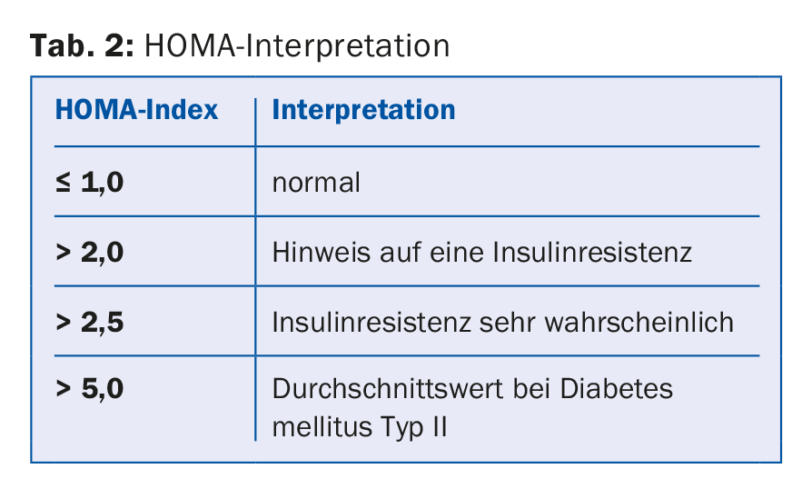 ad 5) Se houver suspeita de síndrome metabólica, a resistência à insulina também deve ser esclarecida. Para este fim, a glicose e a insulina de jejum são determinadas e o índice HOMA é calculado a partir destas. [10] (Tab. 2).